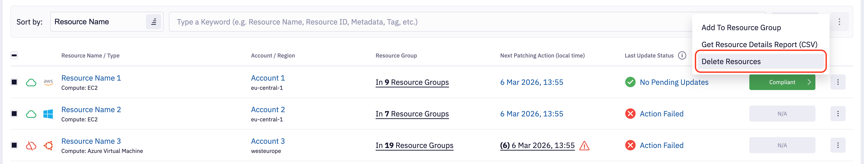 - Single resource - Use the row-level actions menu for one resource.